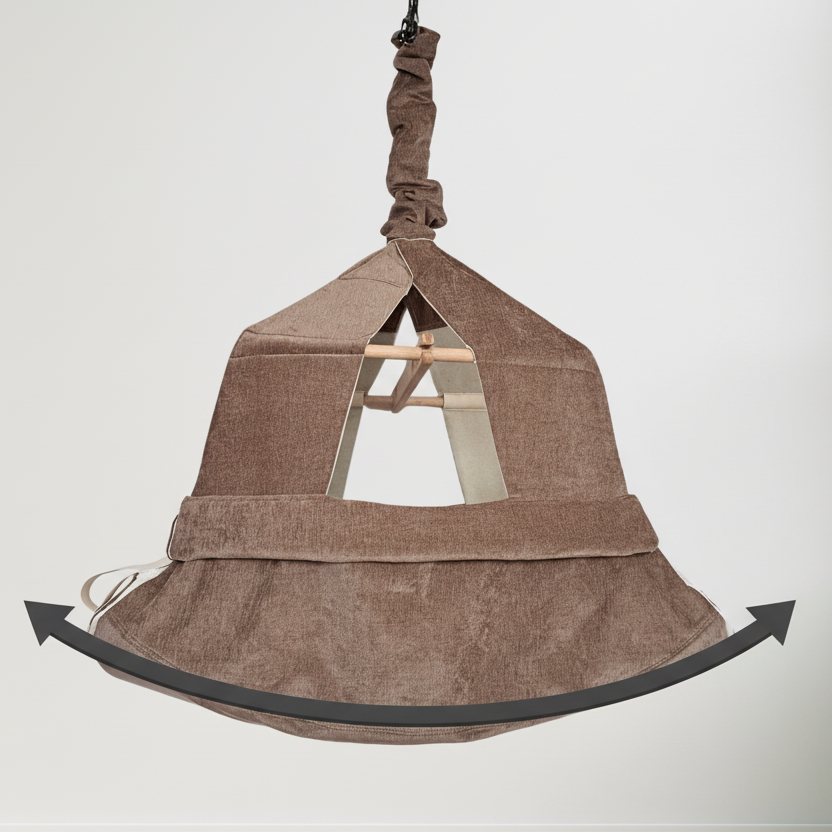 Eine Federwiege hat nur einen einzigen Aufhängepunkt und wippt auf und ab – das ist die Bewegung, die Babys aus dem Mutterleib kennen. Eine Hängematte schaukelt seitlich. Die Wombagee® ist beides: Sie lässt sich flexibel umbauen