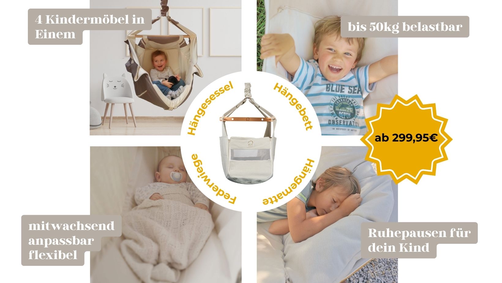 Wie lange man eine Federwiege nutzen kann, hängt von einem einzigen Faktor ab: ob sie mitwächst. Standard-Federwiegen haben ein Gewichtslimit von 9 kg — danach werden sie zum Staubfänger. Die WOMBAGEE® trägt bis zu 50 kg und verwandelt sich Schritt für Schritt: erst Federwiege, dann Hängebett, dann Hängesessel oder Hängematte. 4 Möbelstücke. Eine Anschaffung. Eine ganze Kindheit lang Entspannung und Rückzugsort für dein Kind. Und über 4.000 Familien, die das bereits genauso erlebt haben.